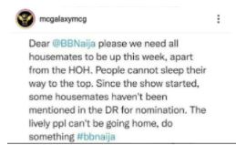 ''Dear @BBNaija please we neead all housemates to be up this week, apart from the HOH, People cannot sleep their way to the top. Since the show started, some housemates haven't been mentioned in the DR for nomination. The lively ppl can't be going home. Do something ''
