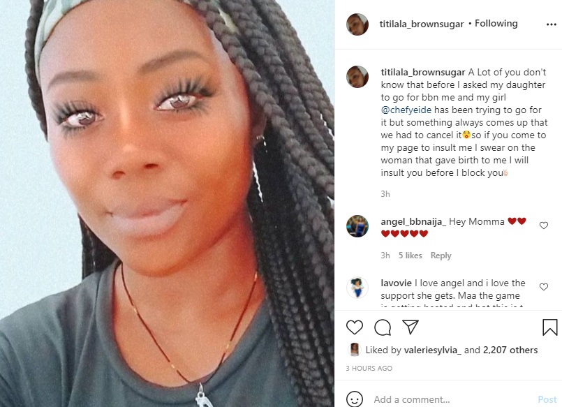 A Lot of you don't know that before I asked my daughter to go for bbn me and my girl @chefyeide has been trying to go for it but something always comes up that we had to cancel it. so if you come to my page to insult me I swear on the woman that gave birth to me I will insult you before I block you.