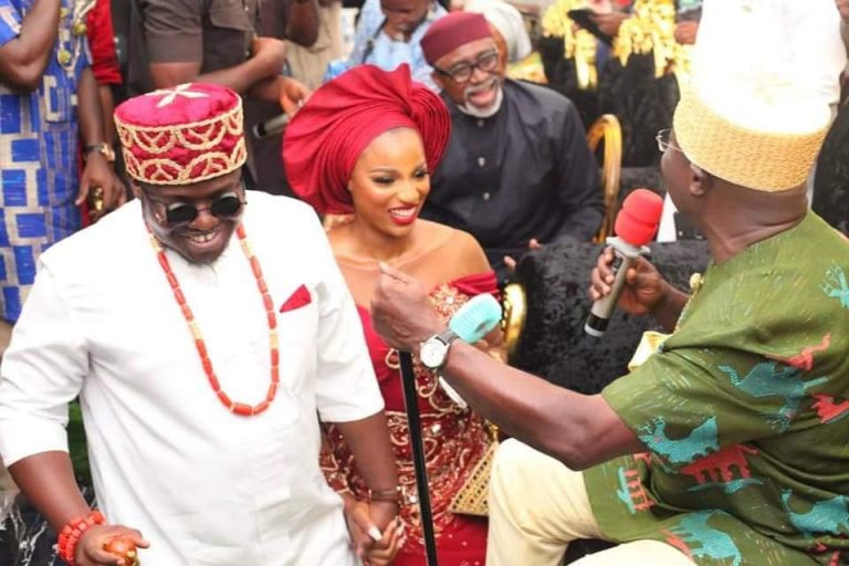 The governor's son got married traditionally to his wife, Nkechi who was clad in colourful attire as they posed for photos.