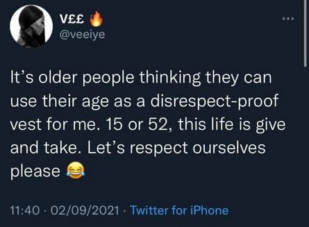Former Big Brother Naija Lockdown finalist, Vee has stated that older people use their age as a "disrespect-proof vest". Vee who asked everyone to respect themselves, stated that "life is give and take".
