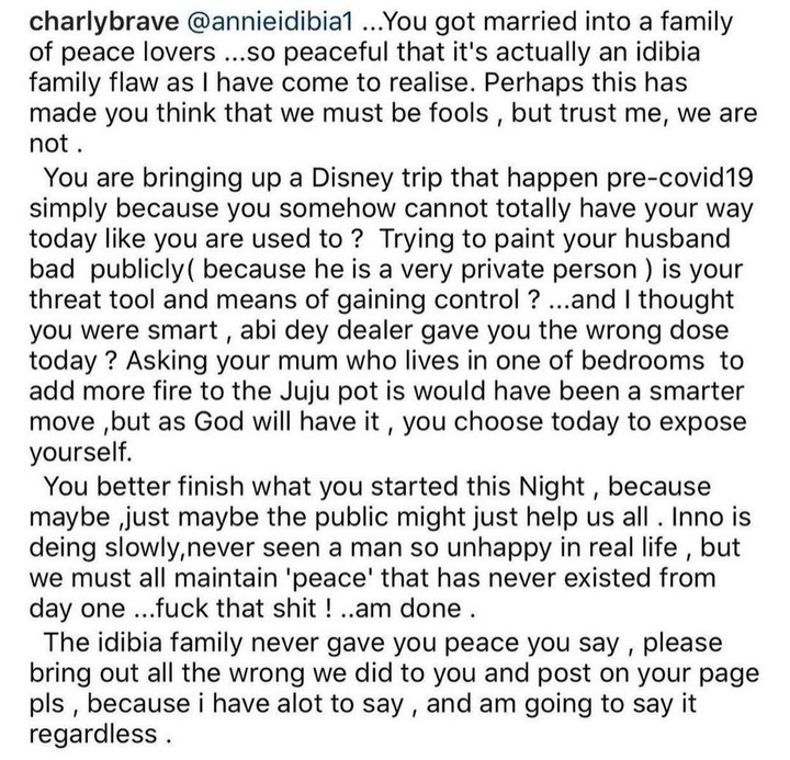 "@annieidibia1 ...You got married into a family of peace lovers ...so peaceful that it's actually an idibia family flaw as I have come to realise. Perhaps this has made you think that we must be fools , but trust me, we are not You are bringing up a Disney trip that happen pre-covidl9 simply because you somehow cannot totally have your way today like you are used to ? Trying to paint your husband bad publicly( because he is a very private person ) is your threat tool and means of gaining control ? ...and I thought you were smart , abi dey dealer gave you the wrong dose today ? Asking your mum who lives in one of bedrooms to add more fire to the Juju pot is would have been a smarter move, but as God will have it , you choose today to expose yourself. You better finish what you started this Night , because maybe ,just maybe the public might just help us all . Inno is deing slowly,never seen a man so unhappy in real life , but we must all maintain 'peace' that has never existed from day one ...Bleep that shit ! ..am done . The idibia family never gave you peace you say , please bring out all the wrong we did to you and post on your page pls , because i have alot to say , and am going to say it regardless."