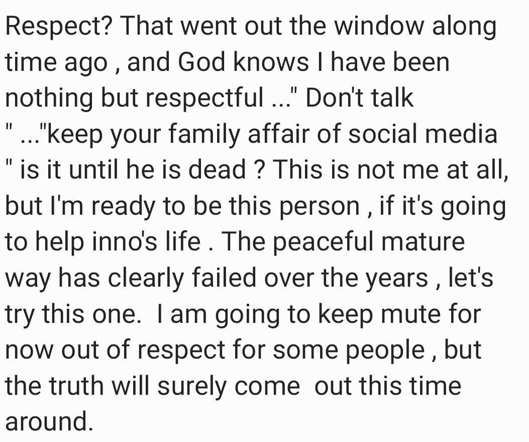 "Respect? That went out the window along time ago , and God knows I have been nothing but respectful ..." Don't talk " ..."keep your family affair of social media " is it until he is dead ? This is not me at all, but I'm ready to be this person , if it's going to help inno's life . The peaceful mature way has clearly failed over the years , let's try this one. I am going to keep mute for now out of respect for some people , but the truth will surely come out this time around."