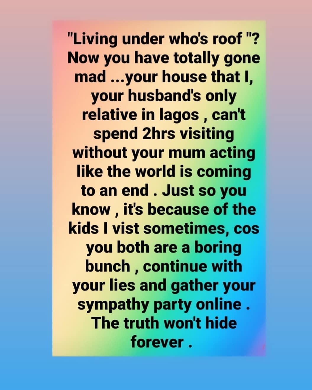 "Living under who's roof "? Now you have totally gone mad ...your house that I, your husband's only relative in lagos , can't spend 2hrs visiting without your mum acting like the world is coming to an end . Just so you know , it's because of the kids I vist sometimes, cos you both are a boring bunch , continue with your lies and gather your sympathy party online. The truth won't hide forever."