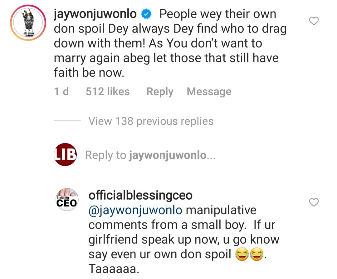 Jaywon then replied to Blessing, whose marriage ended in divorce, by saying that people whose marriages have spoilt are trying to drag other married women down with them.