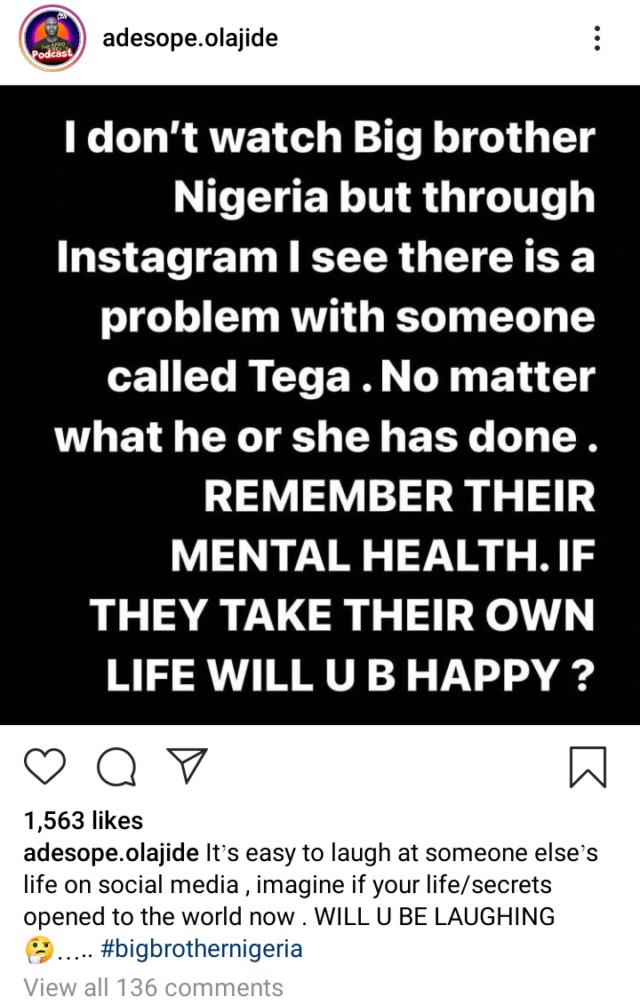 “I don’t watch Big brother Nigeria but through Instagram I see there is a problem with someone called Tega. No matter what he or she has done. REMEMBER THEIR MENTAL HEALTH. IF THEY TAKE THEIR OWN LIFE WILL U BE HAPPY?”