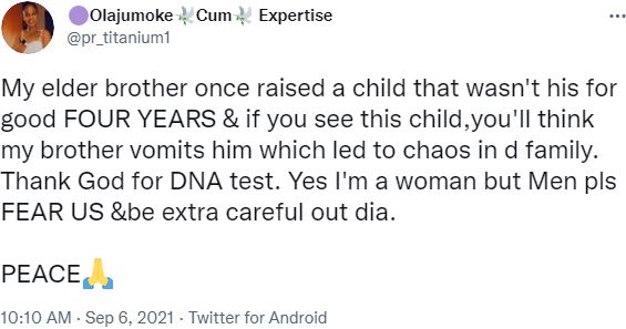 “My elder brother once raised a child that wasn’t his for good FOUR YEARS & if you see this child,you’ll think my brother vomits him which led to chaos in d family. Thank God for DNA test. Yes, I’m a woman but Men pls FEAR US &be extra careful out dia.”