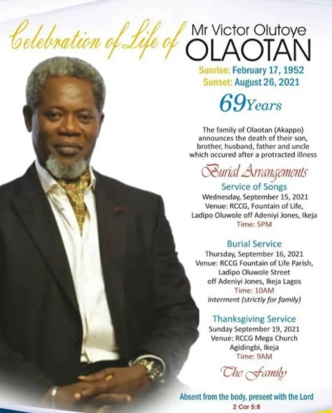 According to the obituary, a service of songs will hold at the RCCG, Fountain of Life parish in Ikeja, Lagos state on Wednesday, September 15 while his remains will be interred on Friday, September 16.