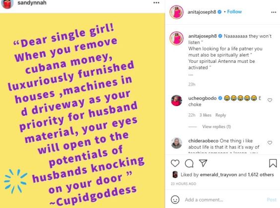 In reaction to this, Anita Joseph said most ladies are blockheads and would still use material things to pick a life partner.