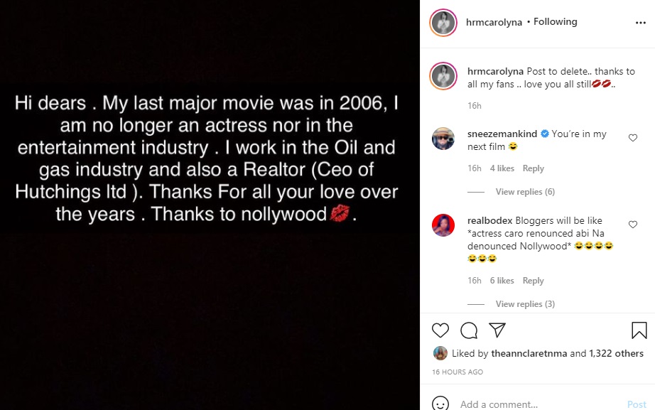 Caroline who thanked her fans for the love over the years, said her last major movie was in 2006. She added that she now works in the oil and gas sector and also a realtor.