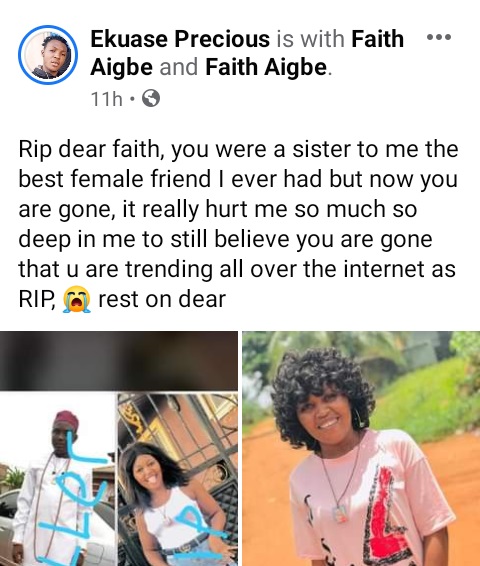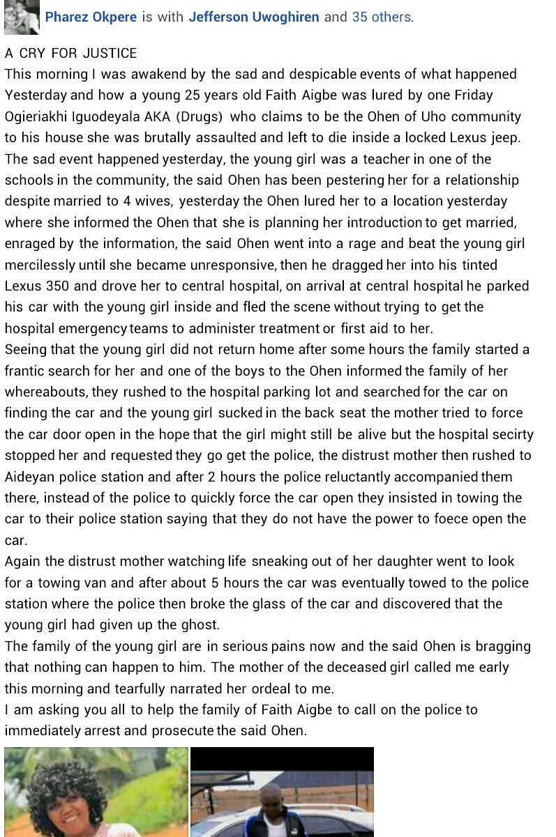 "This morning I was awakend by the sad and despicable events of what happened Yesterday and how a young 25 years old Faith Aigbe was lured by one Friday Ogieriakhi Iguodeyala AKA (Drugs) who claims to be the Ohen of Uho community to his house she was brutally assaulted and left to die inside a locked Lexus jeep
