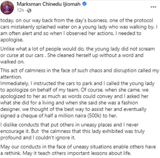 The businessman, Marksman Chinedu Ijiomah, who shared the story on Facebook, said he was driving when one of the cars on his entourage splashed water on the lady who was walking on the road.