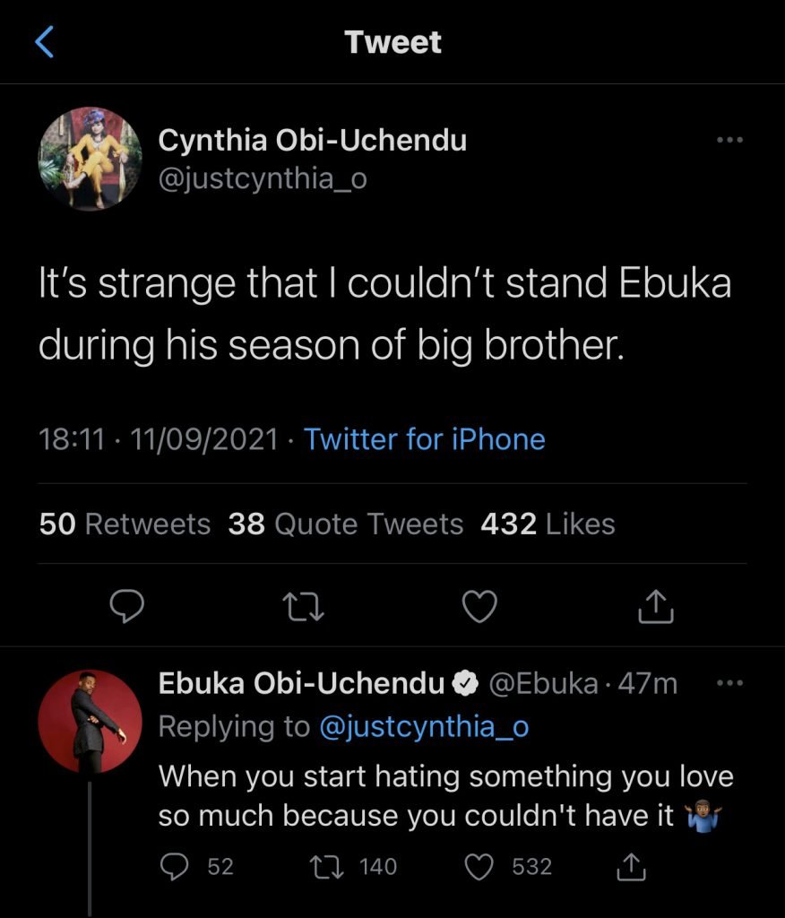 Ebuka, responding to the tweet, wrote: “When you start hating something you love so much because you couldn’t have it.”