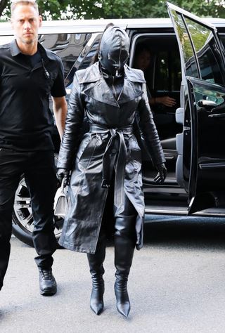 The mother of four was pictured stepping out of a black SUV in the daring outfit, which included a trench coat along with matching gloves, pants and stiletto boots.