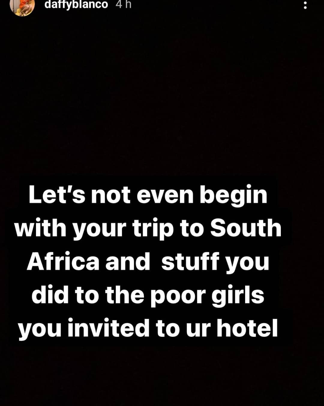 She also claimed this person she referred to as oga likes anal sex and abused ladies he invited to his hotel room during a visit to South Africa.