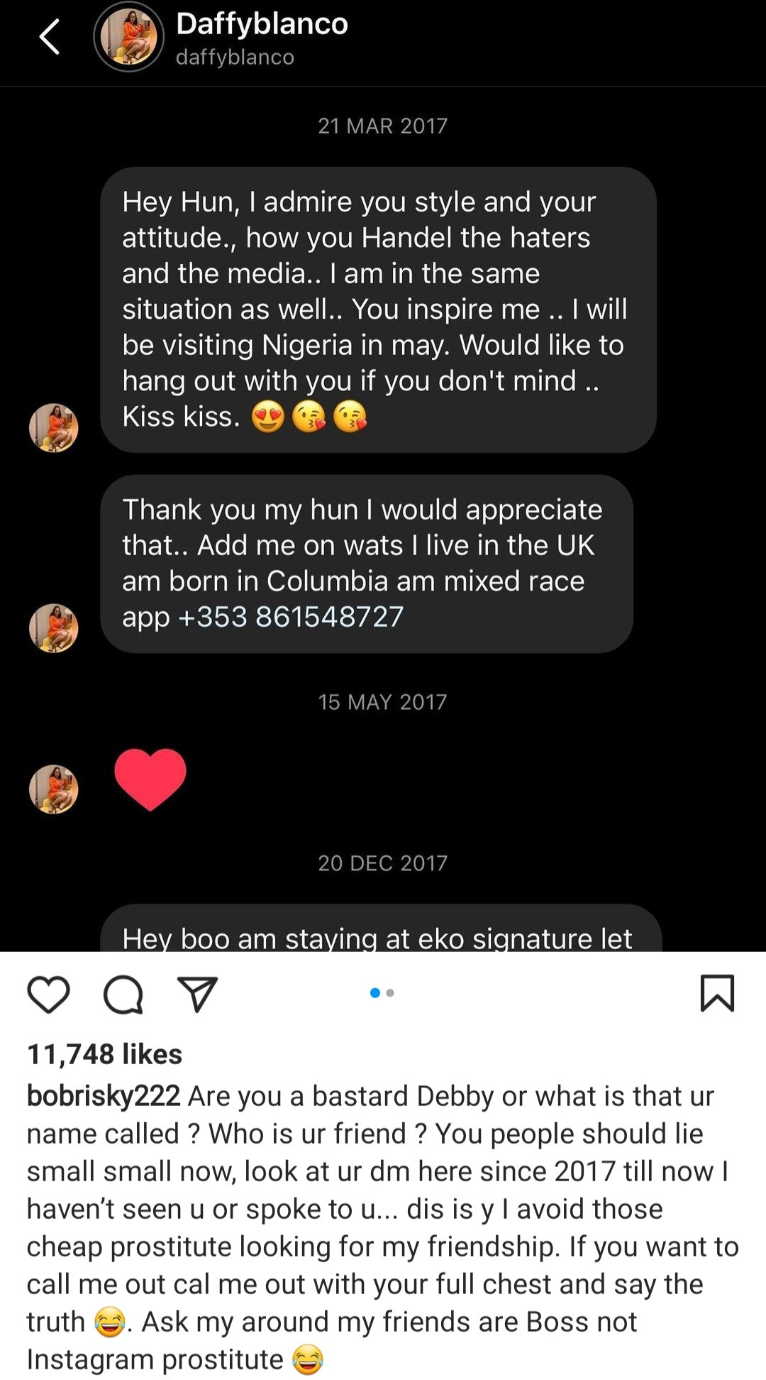 She shared a screenshot of chats Daffy sent to her, asking to meet. Bobrisky added that she rejected Daffy's offer for friendship and they have never met.