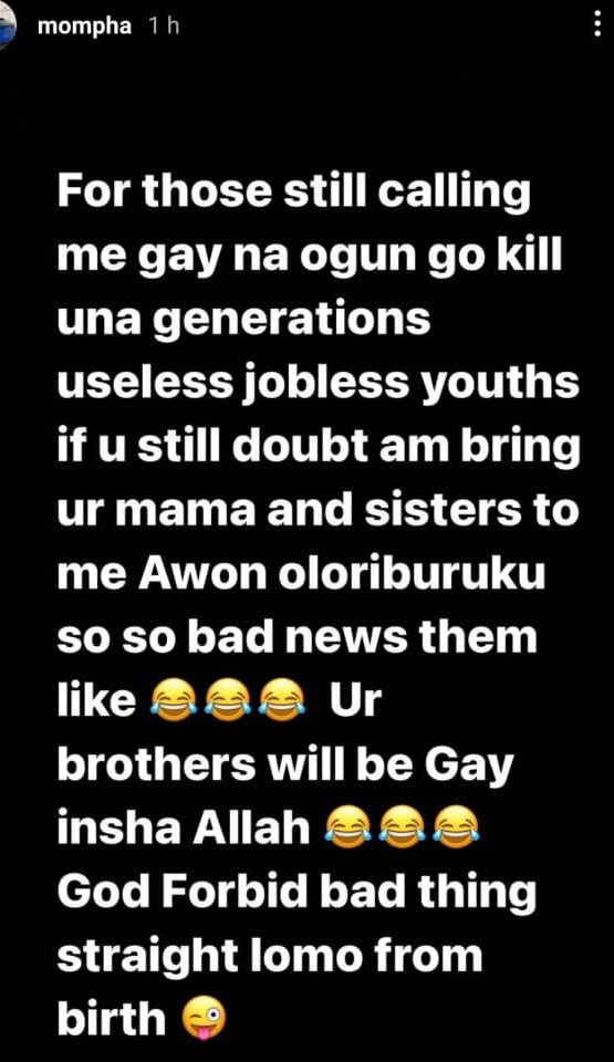 “For those still calling me gay na ogun go kill una generations useless jobless youths if u still doubt am bring ur mama and sisters to me Awon oloriburuku so so bad news them like😂😂😂 Ur brothers will be Gay insha Allah. God Forbid bad thing straight lomo from birth”
