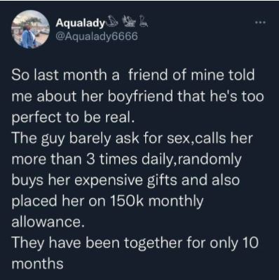 According to @aqualady6666, her friend's boyfriend of 10 months barely asked for sex, called her more than 3 times daily, randomly buys her expensive gifts, placed her on N150k monthly allowance and also gave her access to his phone.