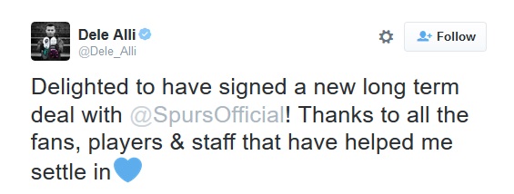 Dele Alli signs new 5-year deal with English Premier league club, Tottenham Hotspurs after an impressive start to career at White Hart Lane.