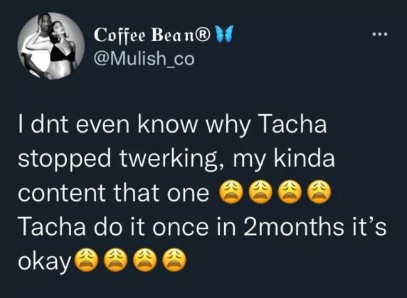“I dnt even know why Tacha stopped twerking, my kinda content that one 😩😩😩😩Tacha do it once in 2months it’s okay😩😩😩😩,”