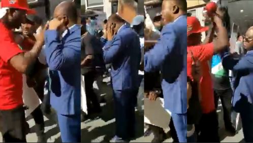 He was, however, slapped when he forced himself on the protesters and pushed one of them, which made the person filming to shout the more as he threatened to beat up the official.