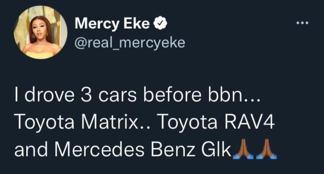 “I drove three cars before bbn… Toyota Matrix..ToyotaRAV4 and Mercedes Benz Glk,” she wrote in a tweet.