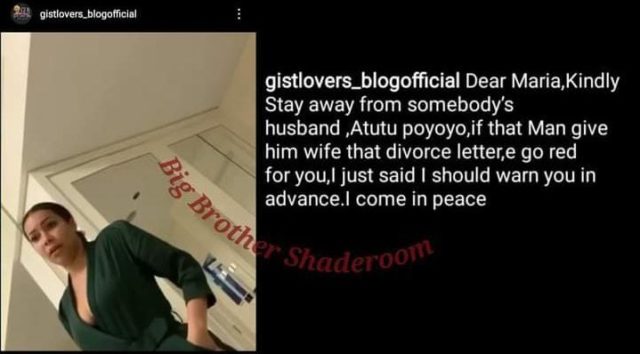 “Dear Maria, kindly stay away from somebody’s husband, Atutu Poyoyo, if that man give him wife that divorce letter, e go red for you, I just said I should warn you in advance. I come in peace,” the blogger wrote.