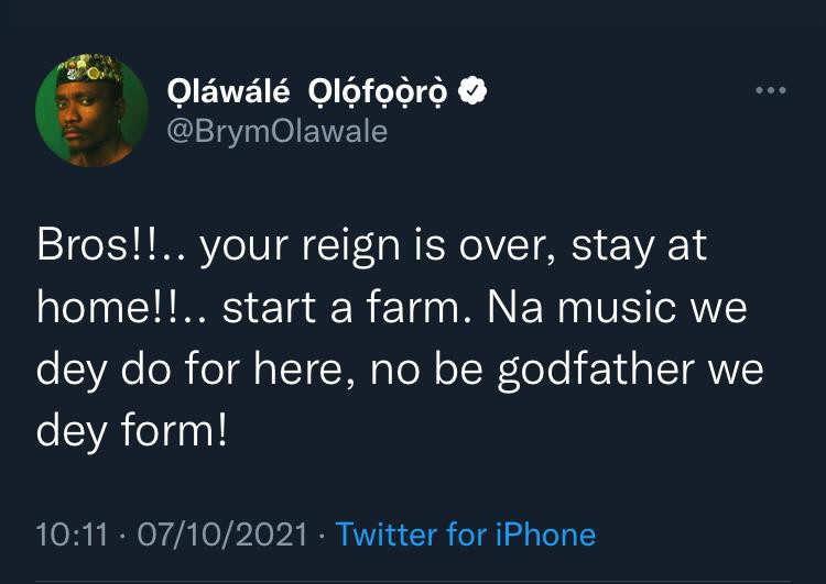 In his reaction, Brymo asked 2face to stay at home as his reign is over.