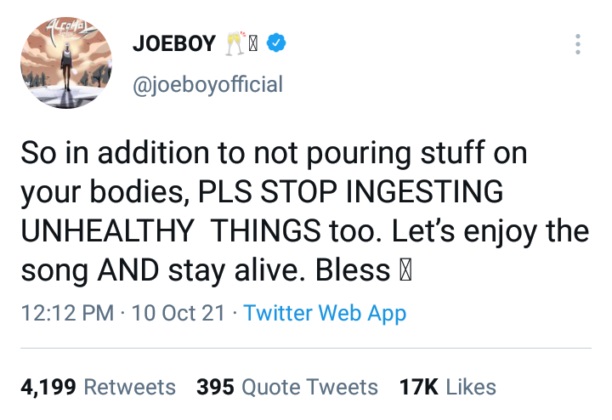 However, taking to his Twitter page, Joeboy who appreciated fans for showing his song much love, pleaded with them to avoid going to the extremes.