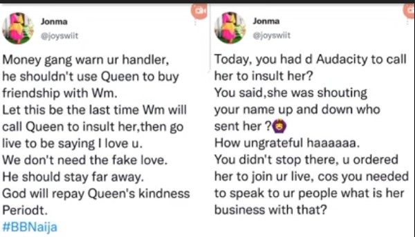 The handler, whose twitter handle is @joyswiit said that WhiteMoney's handler, promise, is trying to use Queen in his pursuit to chase clout for Whitemoney.