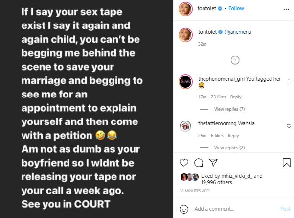 Responding to the petition against her, the mother of one in an Instagram post on Tuesday, insisted that the sex tape exists, she also claimed that Janemena begged her to save her marriage.