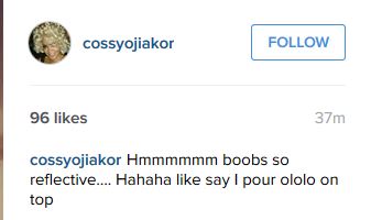 She captioned the first one thus: Hmmmmmm b**bs so reflective.... Hahaha like say I pour ololo on top