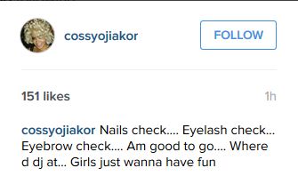 The second image followed immediately. She captioned this one thus: Nails check.... Eyelash check... Eyebrow check.... Am good to go.... Where d dj at... Girls just wanna have fun