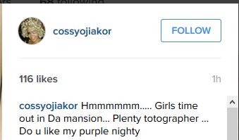 And then the final photo swiftly came following. This time she captioned it: Hmmmmmm..... Girls time out in Da mansion... Plenty totographer ... Do u like my purple nighty
