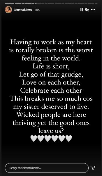 “This breaks me so much cos my sister deserved to live. Wicked people are thriving yet the good ones leave us?” she wrote.