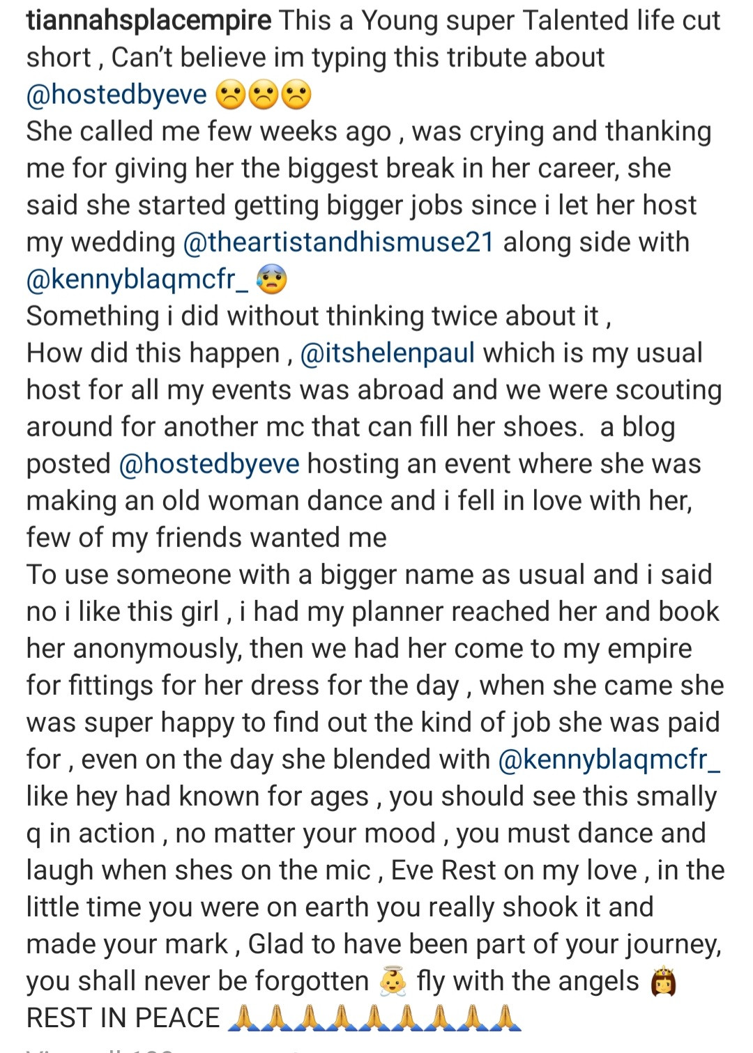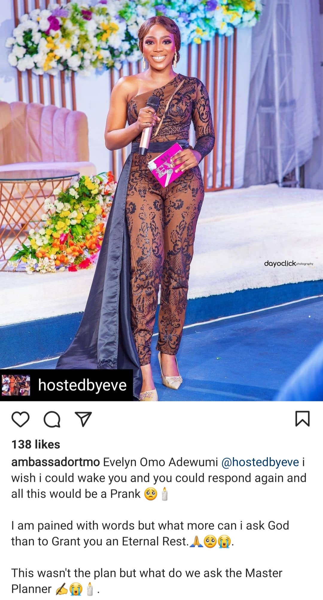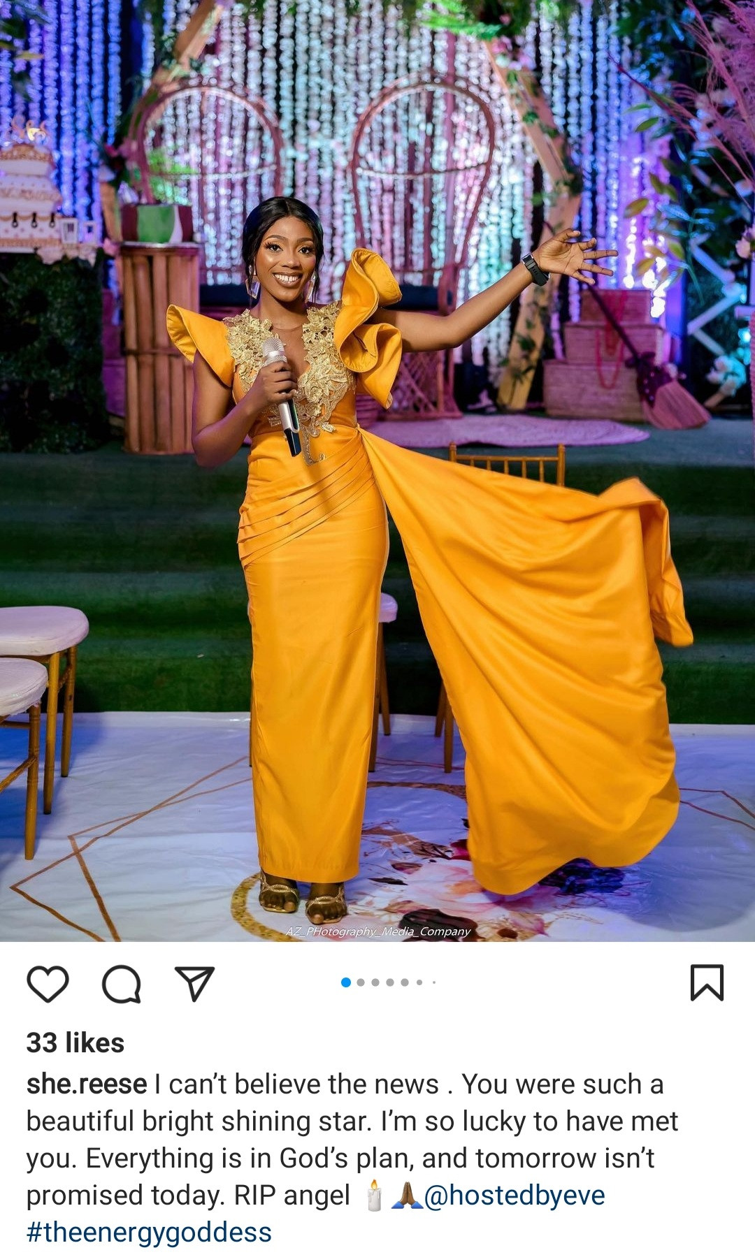 MC Eve hosted Toyin Lawani's wedding months ago. She's has worked with various Nigeiran celebrities, and they have taken to their respective Instagram accounts to mourn her.
