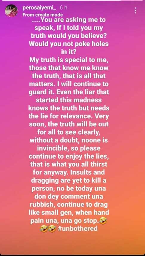 Pero, who had three children for 2Baba, also said she will continue to remain unbothered even with the constant insults and dragging.