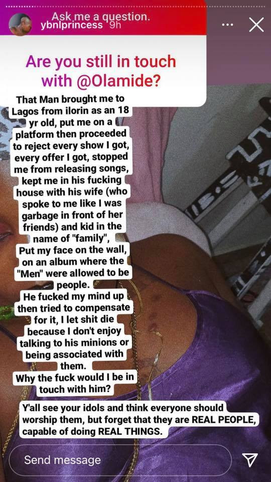 She claimed, “That man brought me to Lagos from Ilorin as an 18-year-old, put me on a platform then proceeded to reject every show I got, every offer I got. Stopped me from releasing songs, kept me in his house with his wife (who spoke to me like I was garbage in front of her friends) and kid in the name of ‘family’. Put my face on the wall, on an album where the ‘men’ were allowed to be people.