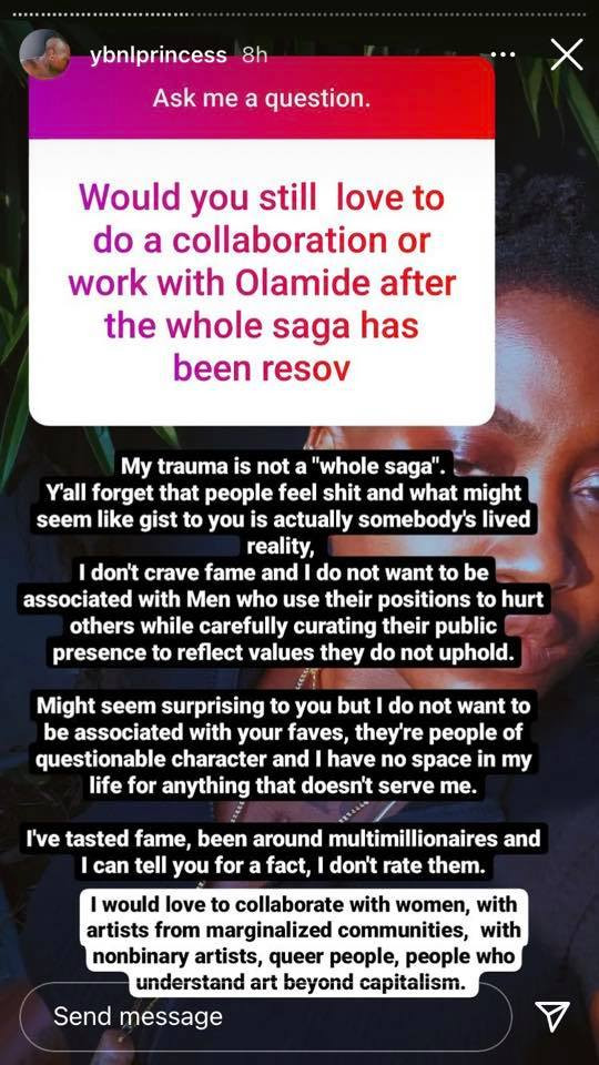 Replying to another question by a fan who asked, “Would you still love to do a collaboration with Olamide after the whole saga has been resolved,” Ovwasa said she does not want to be associated with men who use their position to hurt others.