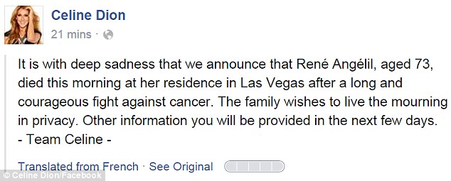 In a statement posted to her official Facebook page, Dion said her beloved husband had a 'long and courageous fight against cancer. The family wishes to live the mourning in privacy.'