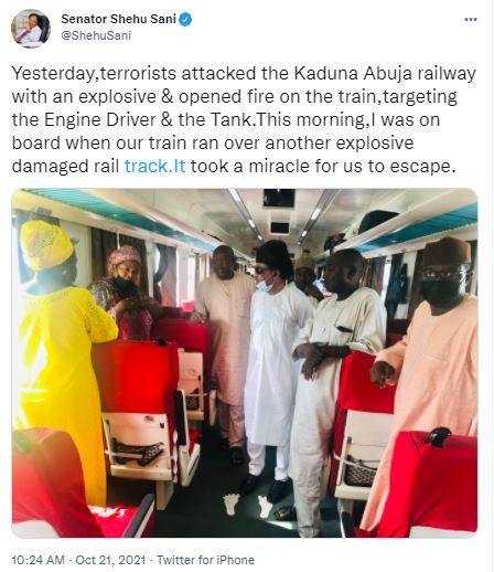 “This morning, I was on board when our train ran over another explosive damaged rail track. It took a miracle for us to escape,” Sani tweeted.