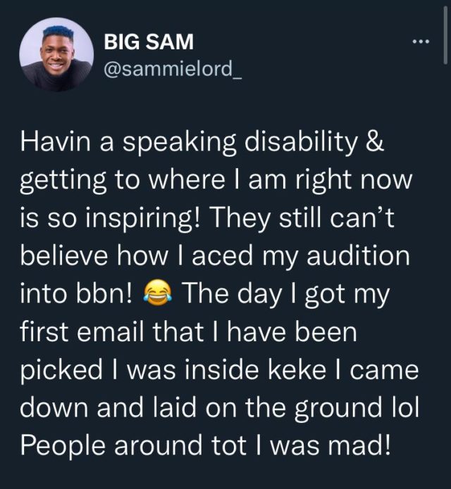 A former BBNaija housemate, Sammie has spoken about his journey to the BBNaija house even though he has a speaking disability.