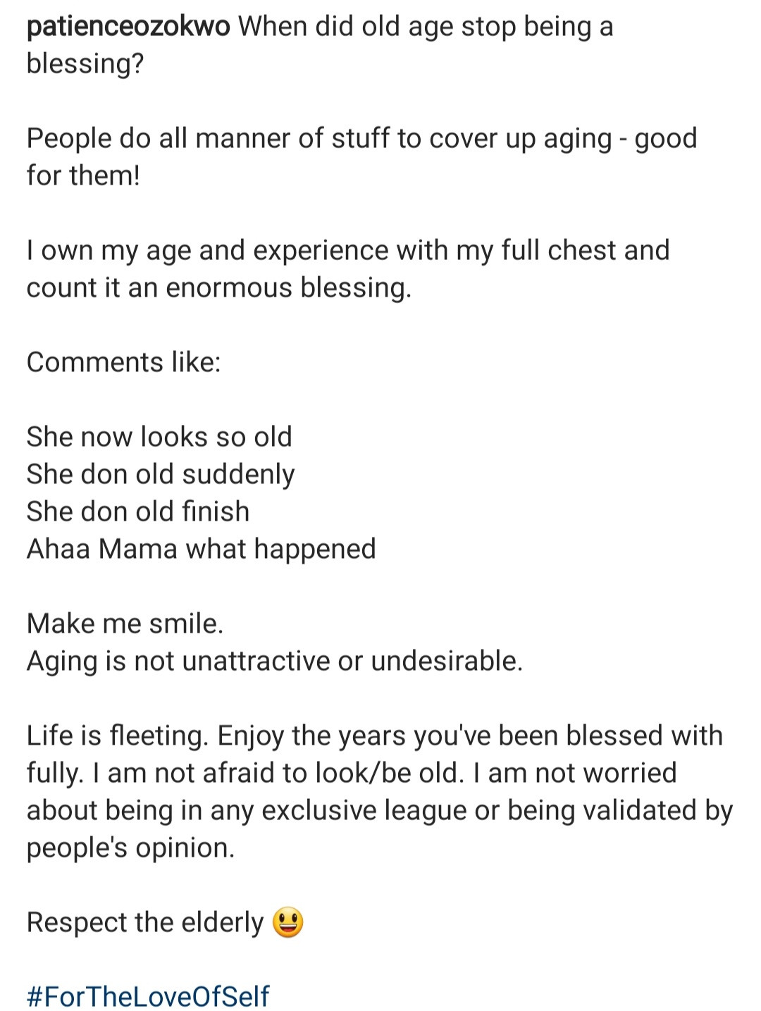 “I own my age and experience with my full chest and count it an enormous blessing. Comments like ‘she now looks so old’, ‘she don old suddenly’, ‘she don old finish’, ‘Ahaa Mama what happened’, make me smile.