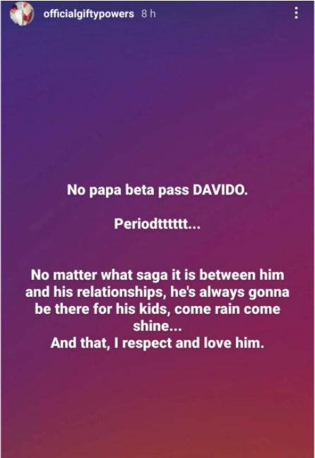 Taking to her Instastories hours after Davido teamed with his ex, Chioma, to throw their son, Ifeanyi, his second birthday party, Gifty wrote; "No papa better pass Davido. Periodttttt...