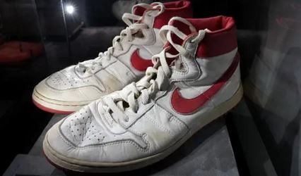 The white leather shoes with the red Nike swoosh and soles were worn by the iconic player in the fifth game of his rookie season with the Chicago Bulls, when Nike’s Jordan-affiliated brand was only just taking off as a sensation both on and off the court.