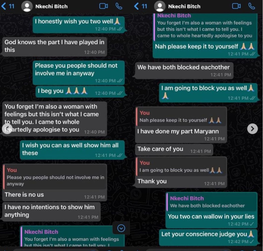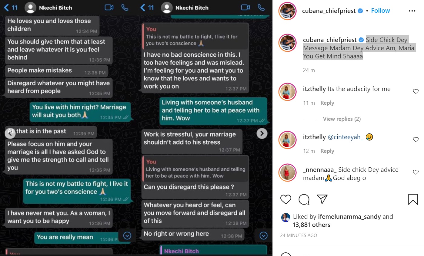 Cubana Chief Priest has come out with receipts showing alleged chat between BBNaija's Maria and the sister she reportedly snatched her husband.