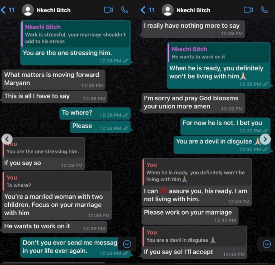 From the chat, Maryanne insinuated that Maria caused her not to be in "talking terms with her husband". She also alleged that the reality show star was living with her husband.