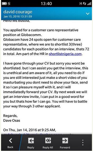 She was asked to masturbate on camera and send the video clip as a way of buying her way into the company. Many other female applicants who applied for the job also reported similar embarrassing cases.