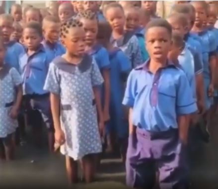 A rather shocking video has emerged online showing school children standing in a flood while singing the national anthem.