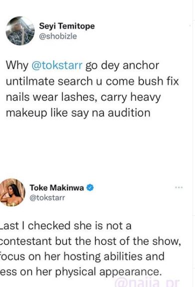 A man has gotten a reply after questioning the dressing of media personality, Toke Makinwa who is the host of the reality show, Gulder Ultimate Search.