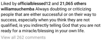 “Always doubting or criticizing people that are either successful or on their way to succy, especially when you think they are not qualified, is you indirectly telling God that you are not ready for a miracle/blessing in your own life.”